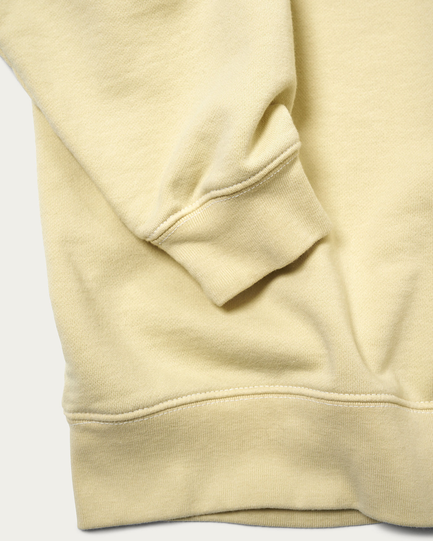 数多くの試作を重ね、たどり着いたスウェットシャツは絶妙な色落ちのヴィンテージ加工を施した一着。カレッジロゴもリアルなヴィンテージアイテムのようにひび割れたプリントで表現しています。また身体を包み込むようなリラックス感のあるシルエットも特徴です。