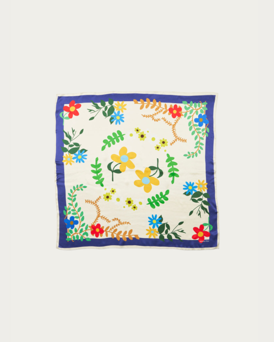 シルク100%のスカーフ。60~70年代のヒッピーカルチャーをベースにポップにアレンジしたデザインがポイント。同コンセプトの図案を落とし込んだワークジャケットやパンツと連動したアイテムです。