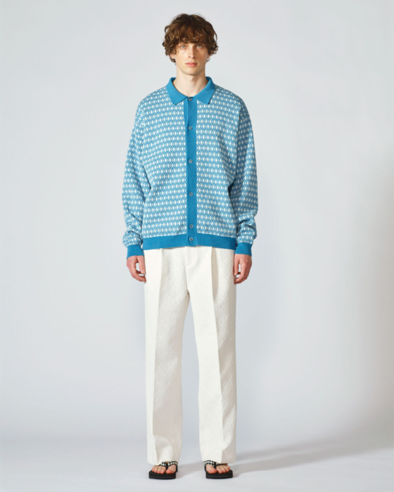 オリジナルのジャガード柄を落とし込んだニットシャツ。フロントを開けてシャツの代わりの羽織やポロシャツっぽく着用しても新鮮なスタイリングに仕上がります。