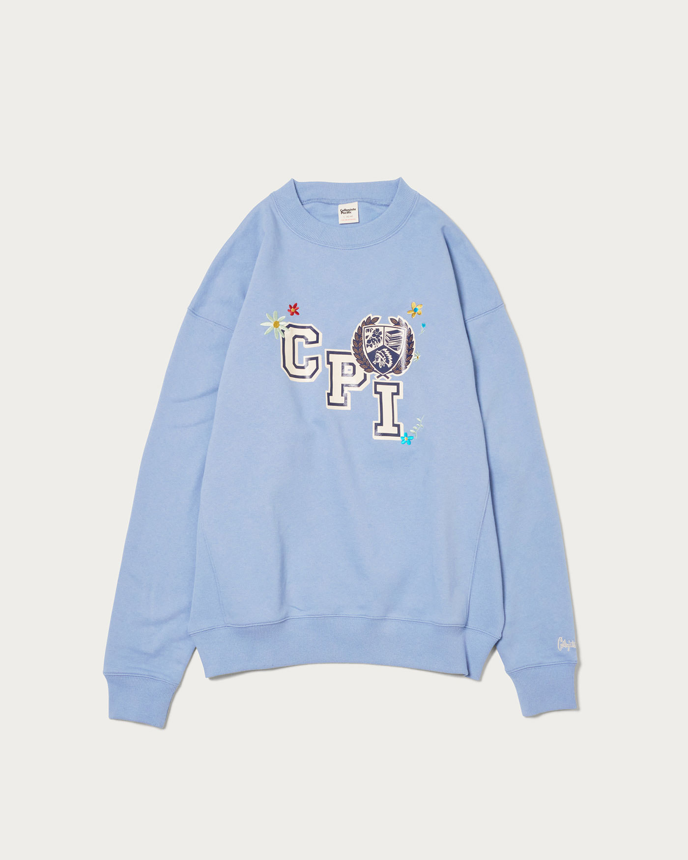 〈Collegiate Pacific〉別注。ビンテージライクなカレッジロゴをベースにまわりにフラワー刺繍をあしらった別注スウェット