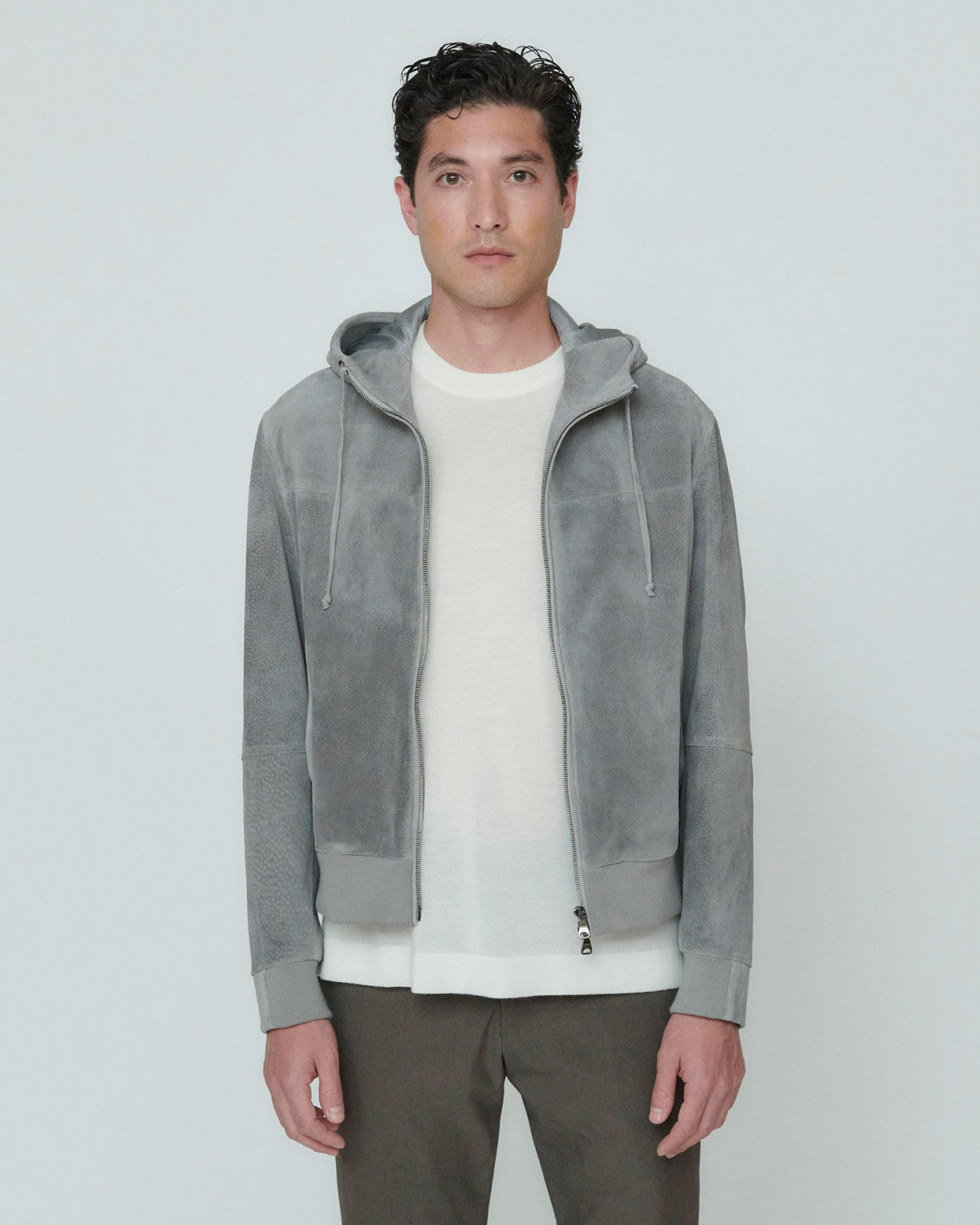 イタリアのアウターブランド〈エンメティ〉に別注したブルゾン。今回はスポーティなデザインの新しいフーデッド型ブルゾンです。ヴィンテージ調の色目を表現したパープルとライトグレーの2色をソブリンの別注カラーとしてご用意しました。さらに身頃にゆとりをもったサイジングにし、フードの内側にシルク素材を用いて、リラックス感とラグジュアリー感を演出しています。また、今回採用している国産の撥水スエードは、ノンクローム鞣し(なめし)の加工方法を用いて環境に配慮した革へと進化したものを使用。とてもしなやかで肌触りもよいやわらかい質感が魅力です。きれいめな装いに合わせるのもいいですが、スウェットやカットソーなどの上にさっと羽織っても様になるデザインとなっています。