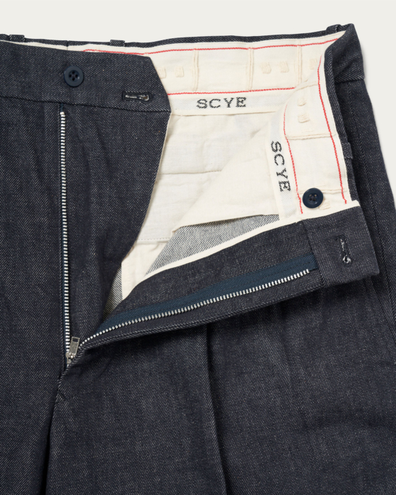 独自のパターン技術で好評を博すブランド<サイ>の定番である2プリーツパンツに、インディゴブルーとブラックのデニム素材で別注しました。シンプルな着こなしでも映えるデニムトラウザーズです。