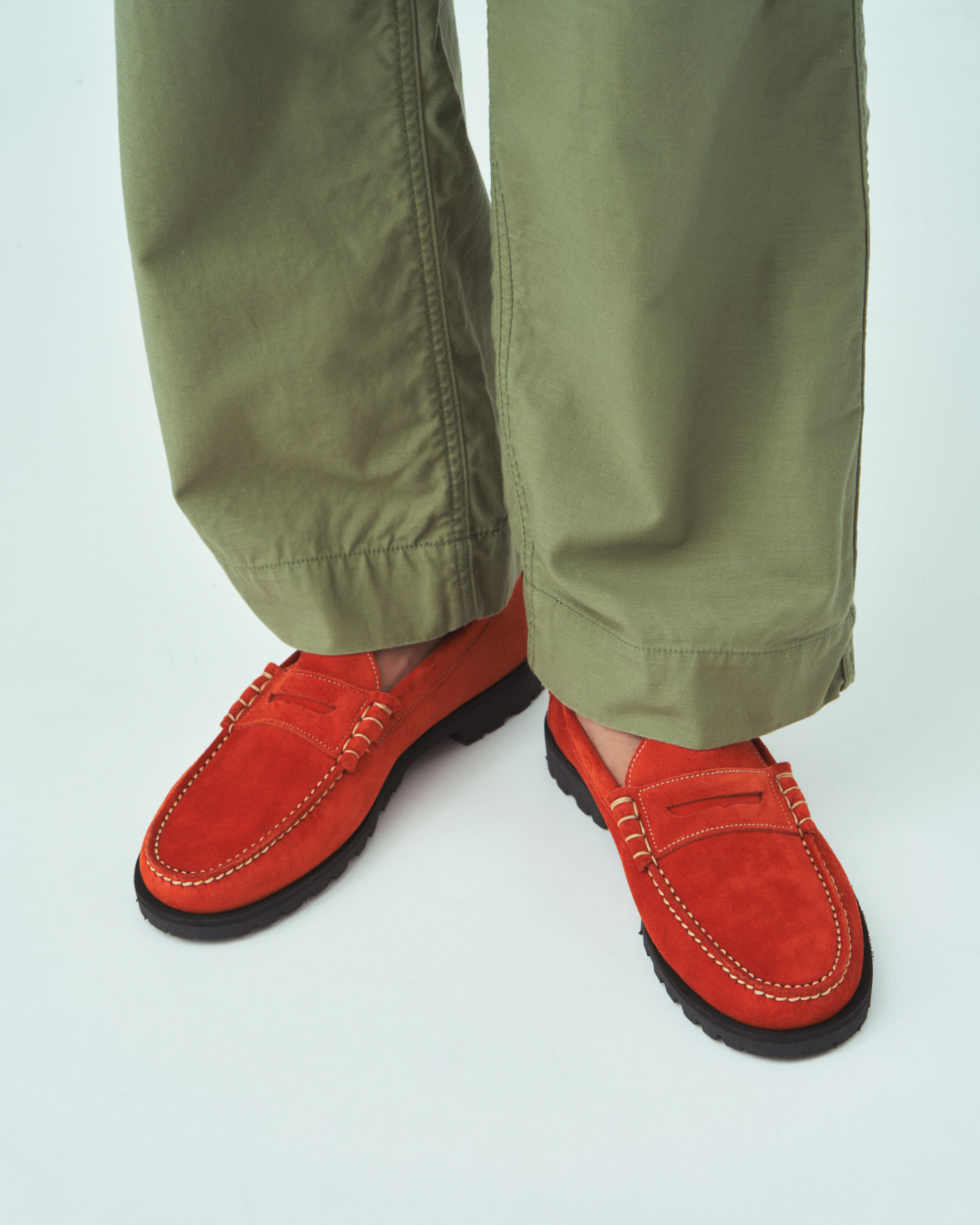 スペイン製コインローファーモデルの「コロー」をベースに、レイドソールに変更し通常展開のない素材を採用した別注モデル。モダンで軽快に履いて頂きたいイメージで用意しました。