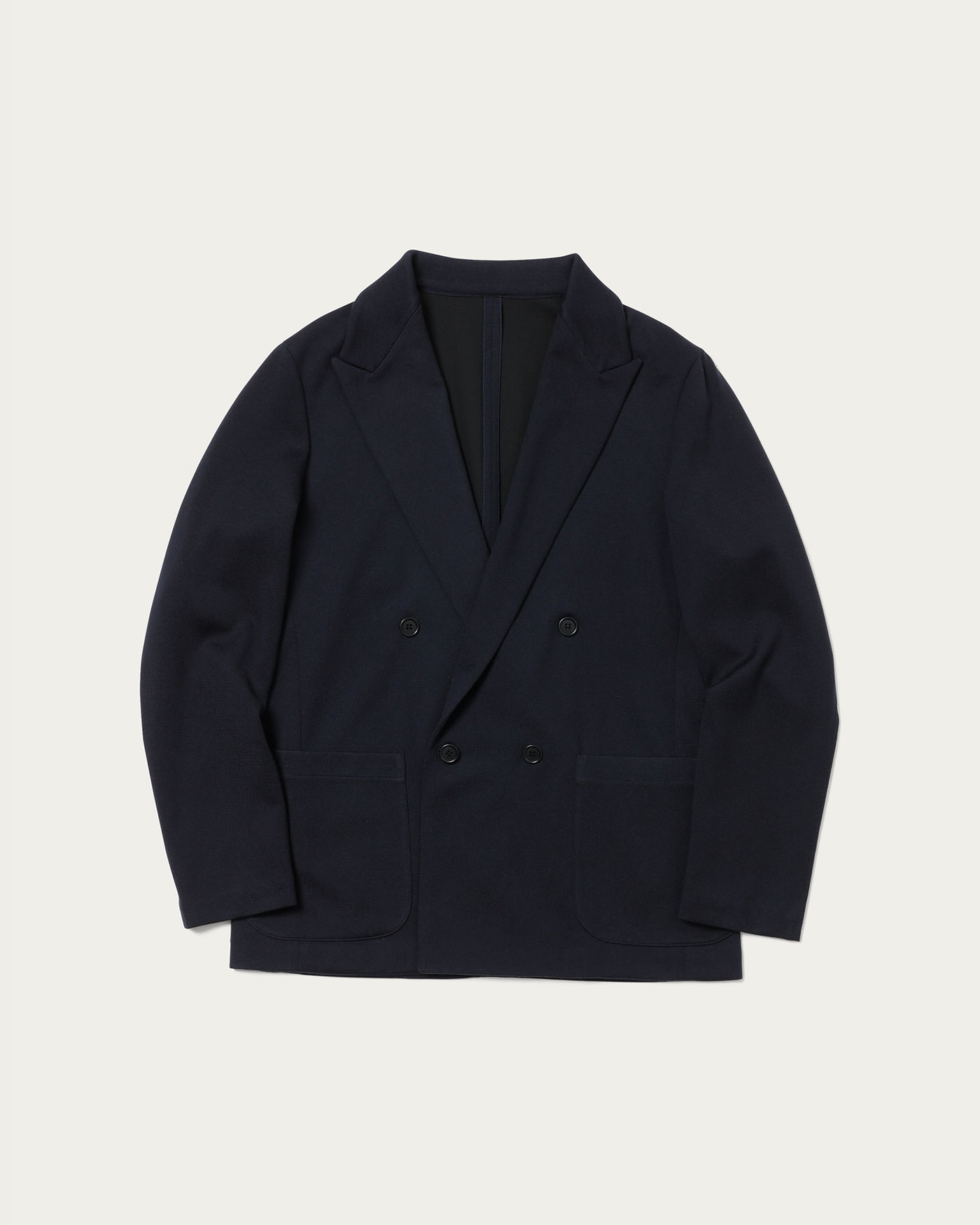 天竺ニットを布帛仕立てにした4つボタンのダブルブレストジャケットです。裏にボンディングを施し、保形性を持たせているのがポイント。ニットの持つ柔らかさから羽織り感覚で着用でき、肩肘張らずにリラックスしたスタイリングが可能です。