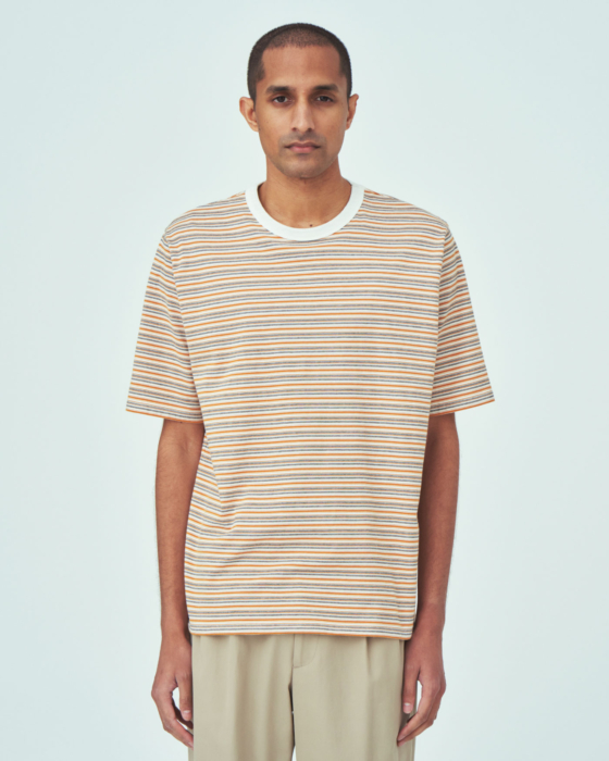 超長綿を軽やかな配色のマルチボーダーで組み合わせた上品なショートスリーブTシャツ。光沢感と肌触りの良さが特徴の素材で、適度にリラックスしたサイジングと品の良い配色がポイントです。