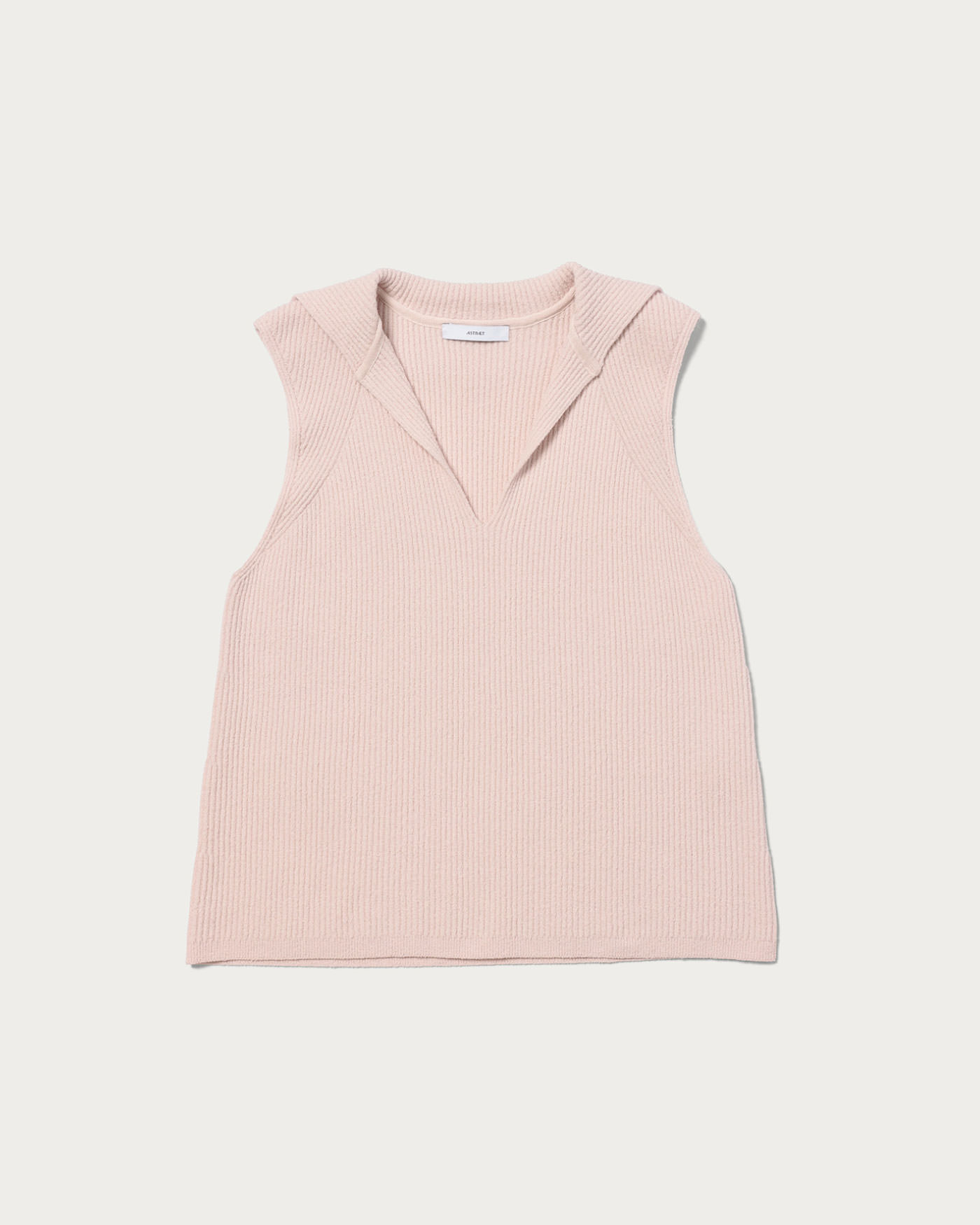 1枚で着用いただいても様になるポロカラーの畔編みニット。胸に斜めに編地を入れてシンプルになりすぎないようにしています。細いコットン糸をベースに小さなループを作った糸でハリ感のある編地は、軽やかでさらりとしたタッチが特徴のニットです。