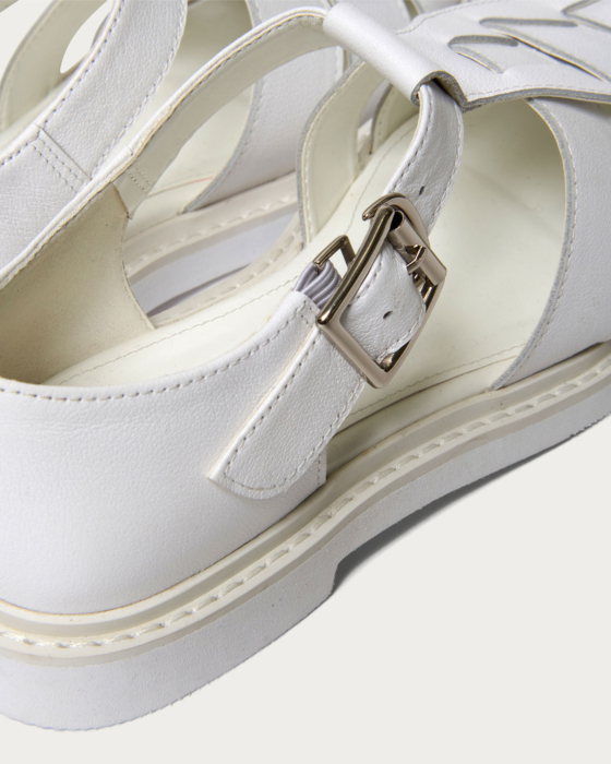 春夏のトレンドとして注目を集める、グルカサンダル。程よく肌の透けるアッパーが、シーズンライクな抜け感を演出します。ヌーディーな女性らしさの中にも、旬なボリュームソールがカジュアルな雰囲気をプラス。アンクル部分のベルトは、サイズの微調整が可能な便利なデザインです。