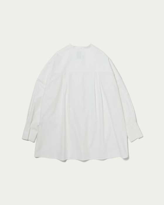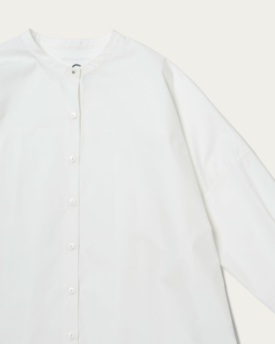 MARWの定番バンドカラーシャツ。長めの着丈やカフス、大胆なドロップショルダーが特徴です。ハリ感のあるポリエステルのブロード素材を使用し、前立ては比翼仕立て、襟元はギボシ釦にすることでドレッシーな印象に。ダーツを入れたバックスタイルはすっきりかつ立体的なシルエットで、シャツ特有の窮屈感を感じずに着用いただけます。