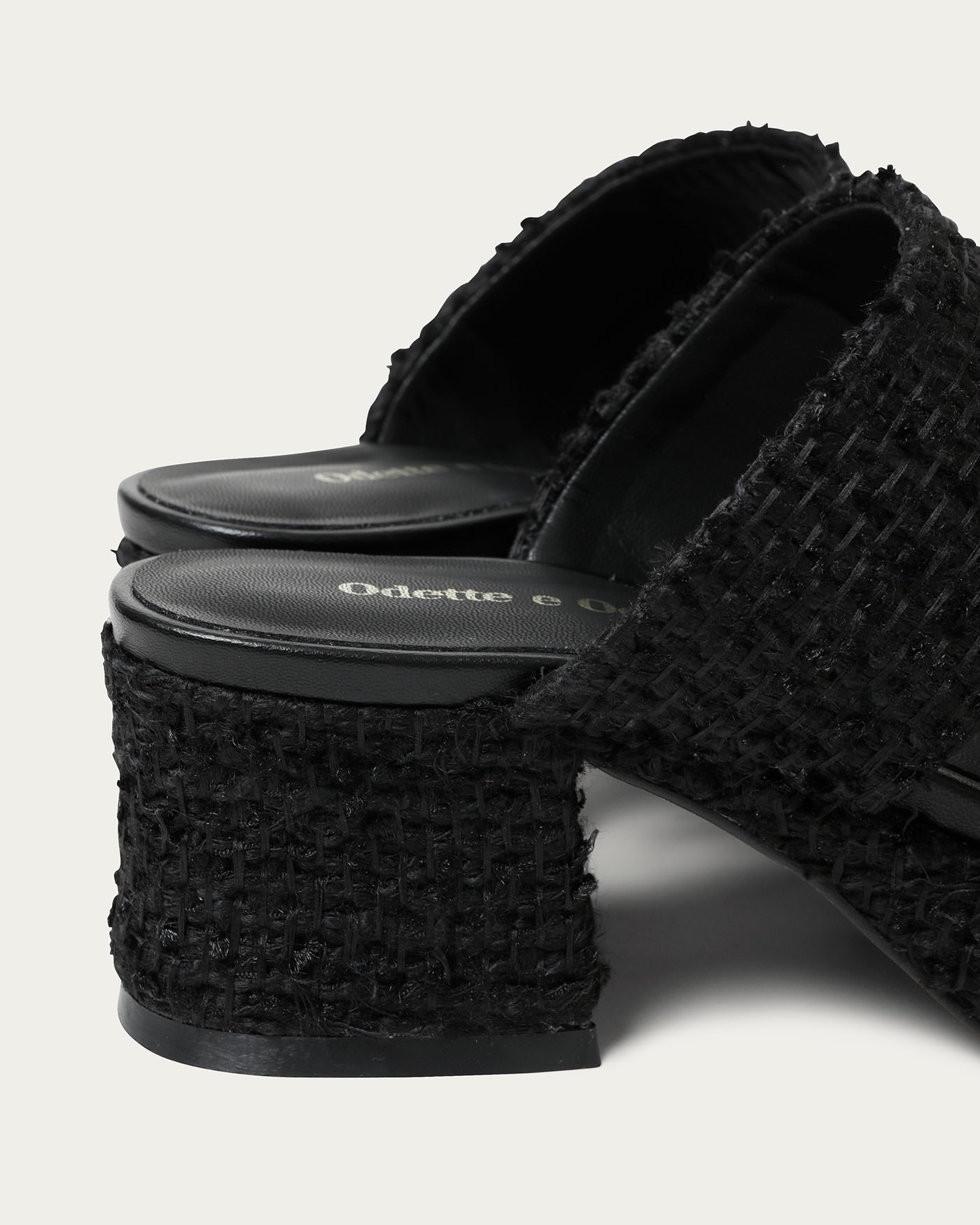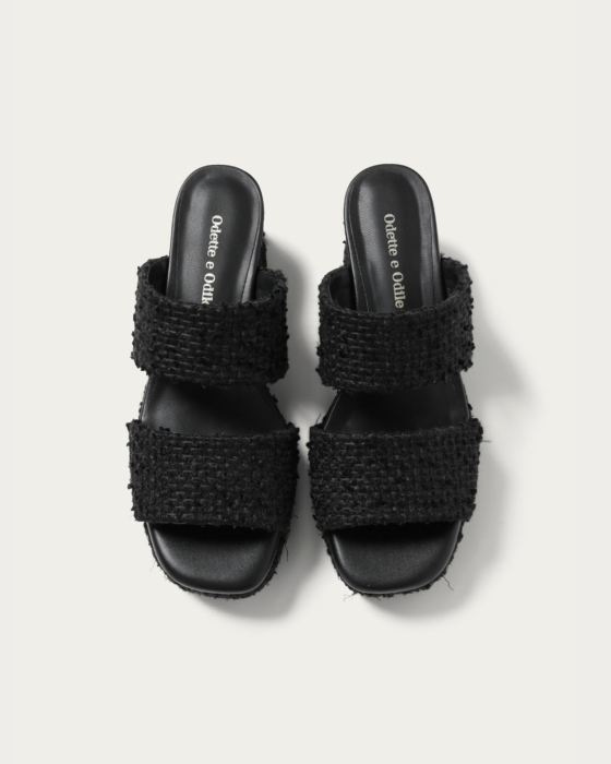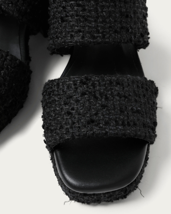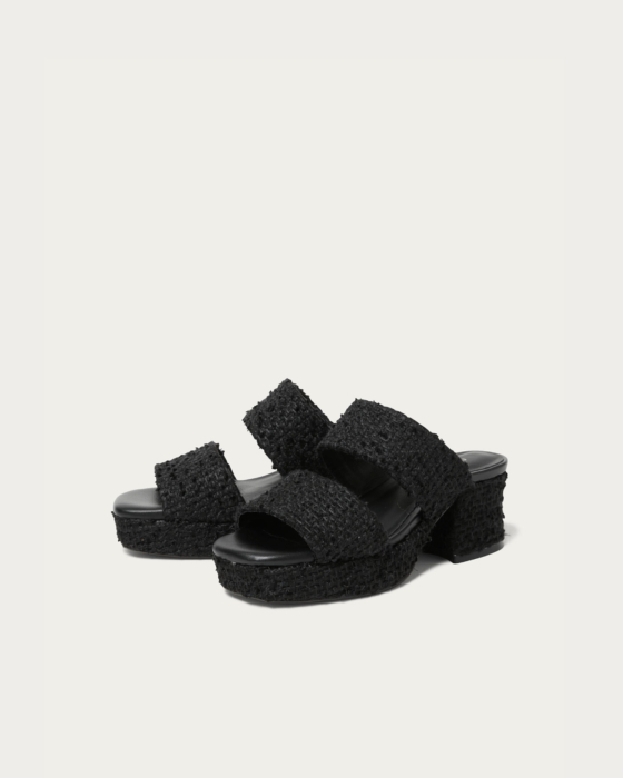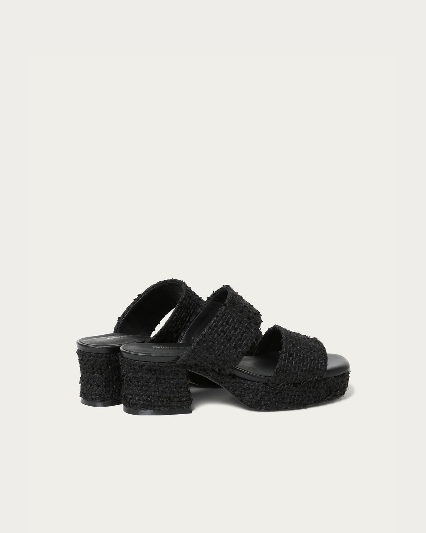 スタイルアップが叶うプラットフォームのミュールサンダル。中敷きや甲ベルトにクッションスポンジを入れ、足当たりの良さもポイント。ツイード調で存在感のあるブラックやクリームイエローカラーなど足元にアクセントをプラスできるカラー展開にも注目です。取り入れるだけで鮮度のあるスタイリングに仕上がるおすすめの一足。