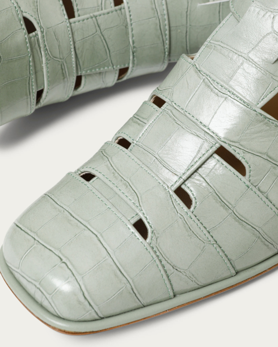 今シーズンも引き続き注目のグルカデザイン。マニッシュなクロコの型押しに優しい色を合わせることでフェミニンな装いにもマッチ。ソール全体を同色で仕上げ、メンズライクなアイテムに適度なボリューム感と女性らしいやわらかさをプラスしました。ストラップ付きでホールド感があるのも嬉しいポイント。