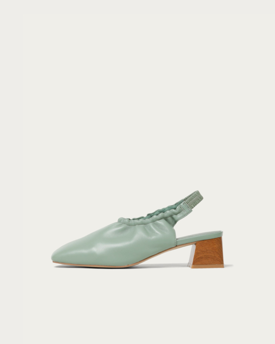 履き口にギャザーをよせたソフトなアッパーが足当たりの良いバックベルトパンプス。木目調プリントのヒールはほどよい高さでスタイルアップが叶いつつも安定感があり、バックベルトはゴム仕様でしっかりと足を支えてくれます。リラックス感のあるデザインで、カジュアルなスタイリングにおすすめの一足。