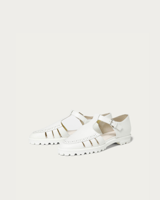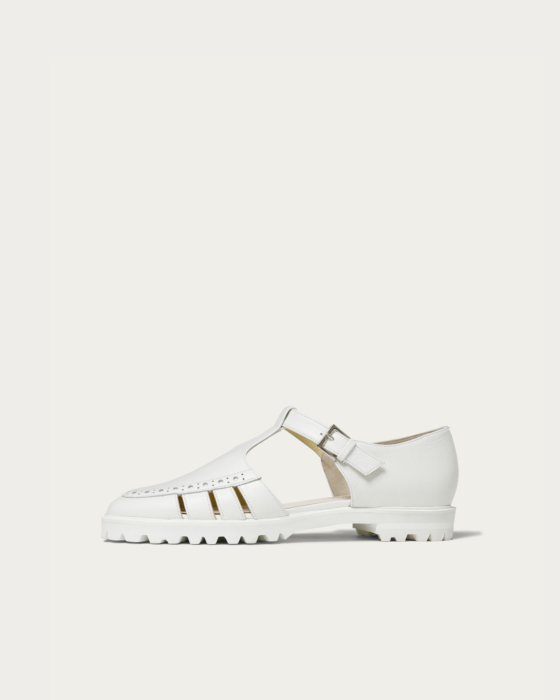 ボリュームソールタイプのTストラップシューズです。ベルト部分はゴム仕様で着脱しやすく、ナチュラルな雰囲気のある素材がさりげなくカジュアルさをプラス。サイドに開きのあるグルカ風のデザインは、フェミニンなコーディネートに合わせていただくのもオススメです。