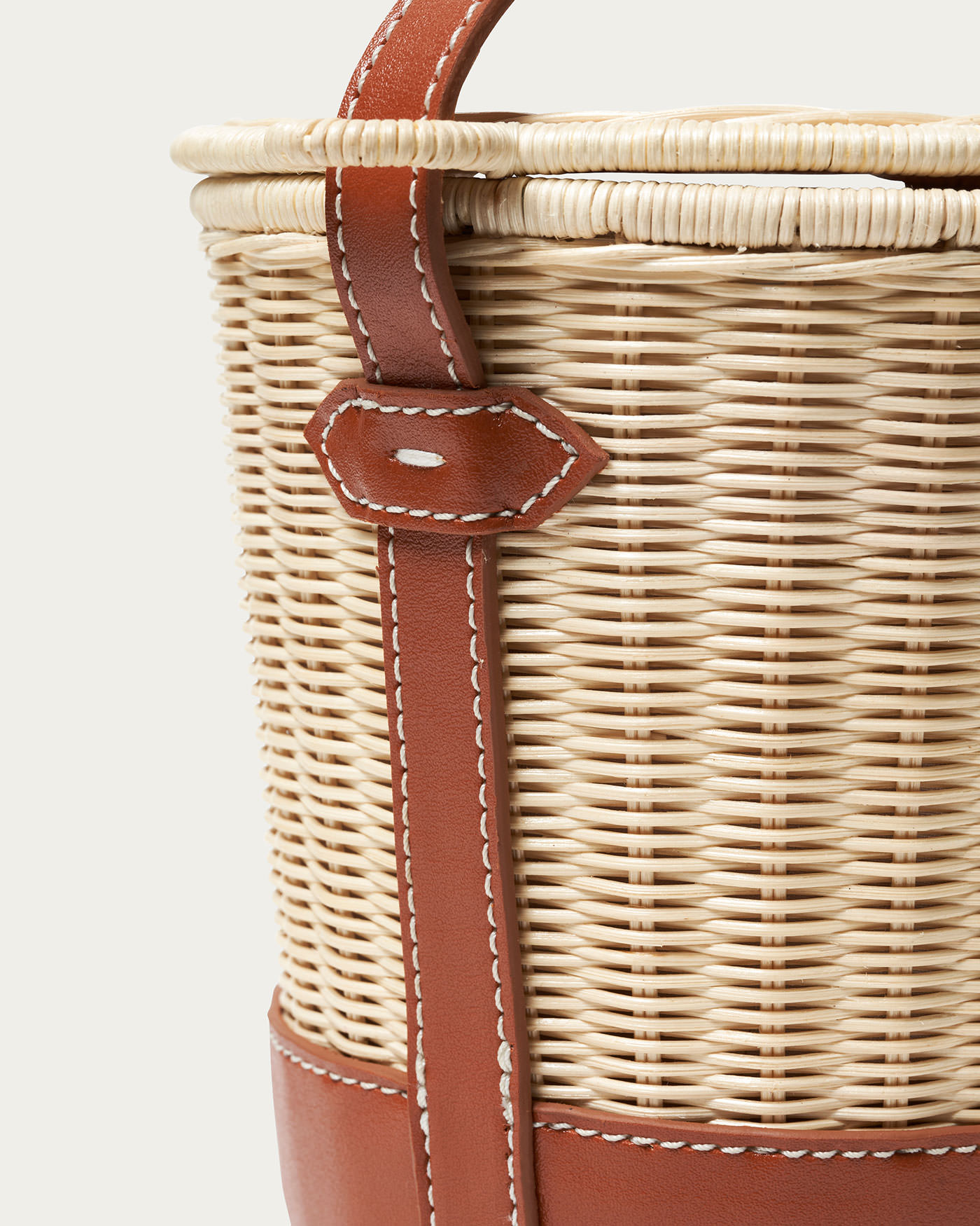 レザーのトリミングがアクセントになり、上品さをプラスしたカゴバッグ。カジュアルさときれいめな印象を兼ね備えた一品です。本体と分裂するデザインのふたは、中身の出し入れがしやすいのもポイント。エフォートレスなバカンススタイルからシックなコーディネートまで幅広くマッチします。
