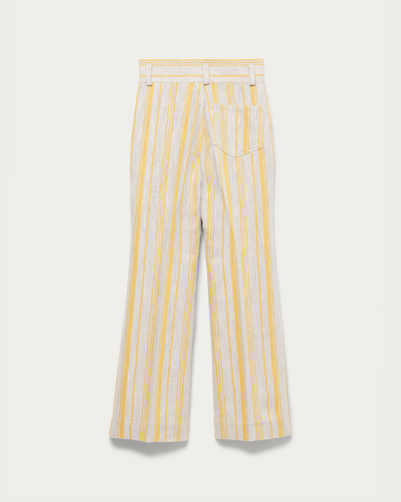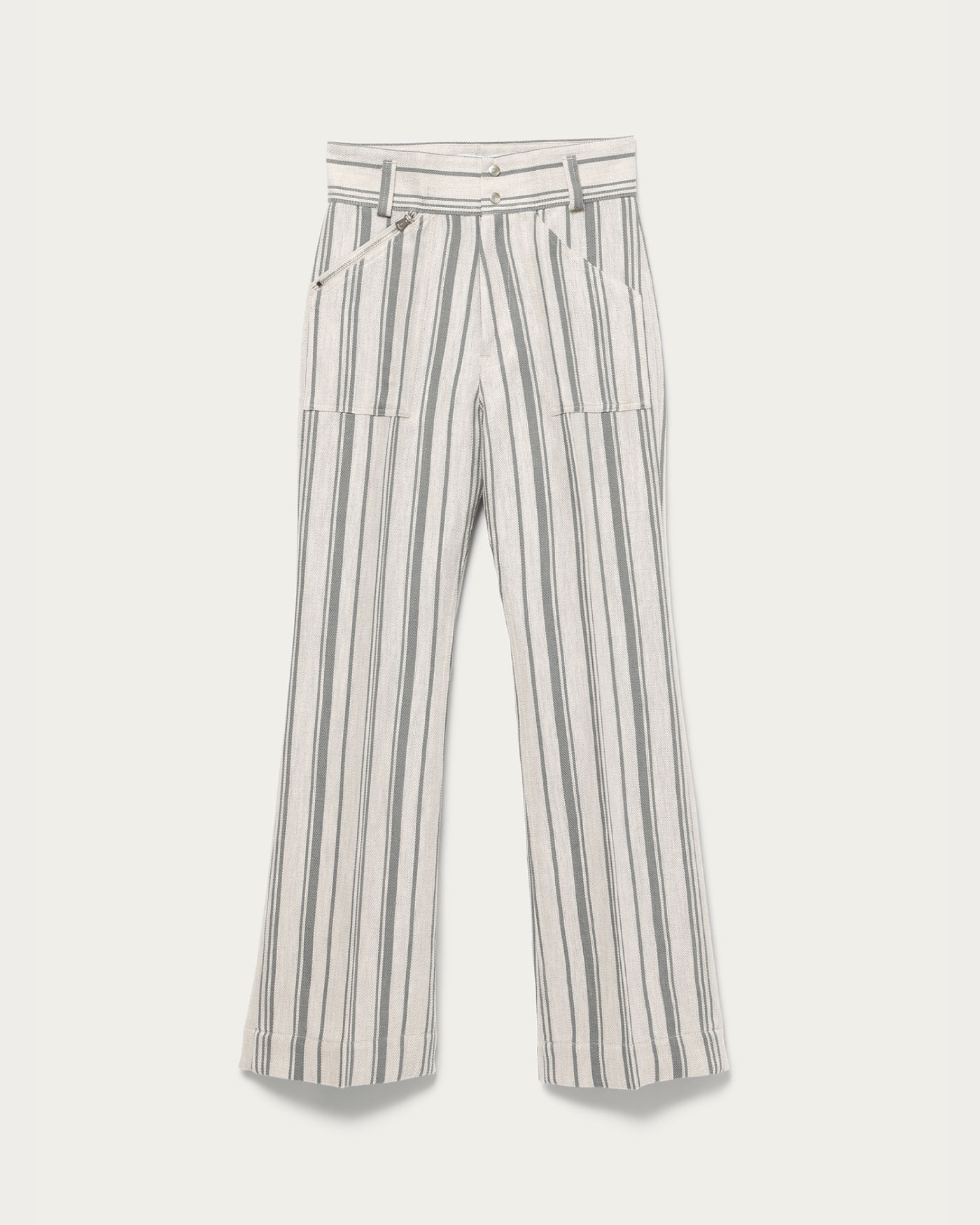 ストライプ柄が印象的なストレートパンツは麻混のドライな風合いも魅力。ダークグレーはユナイテッドアローズ別注カラーです。片側ポケットにほどこした、ジップもアクセントとして効果的。ややハイウエスト設定の細身なシルエットはレッグラインを綺麗に見せてくれます。