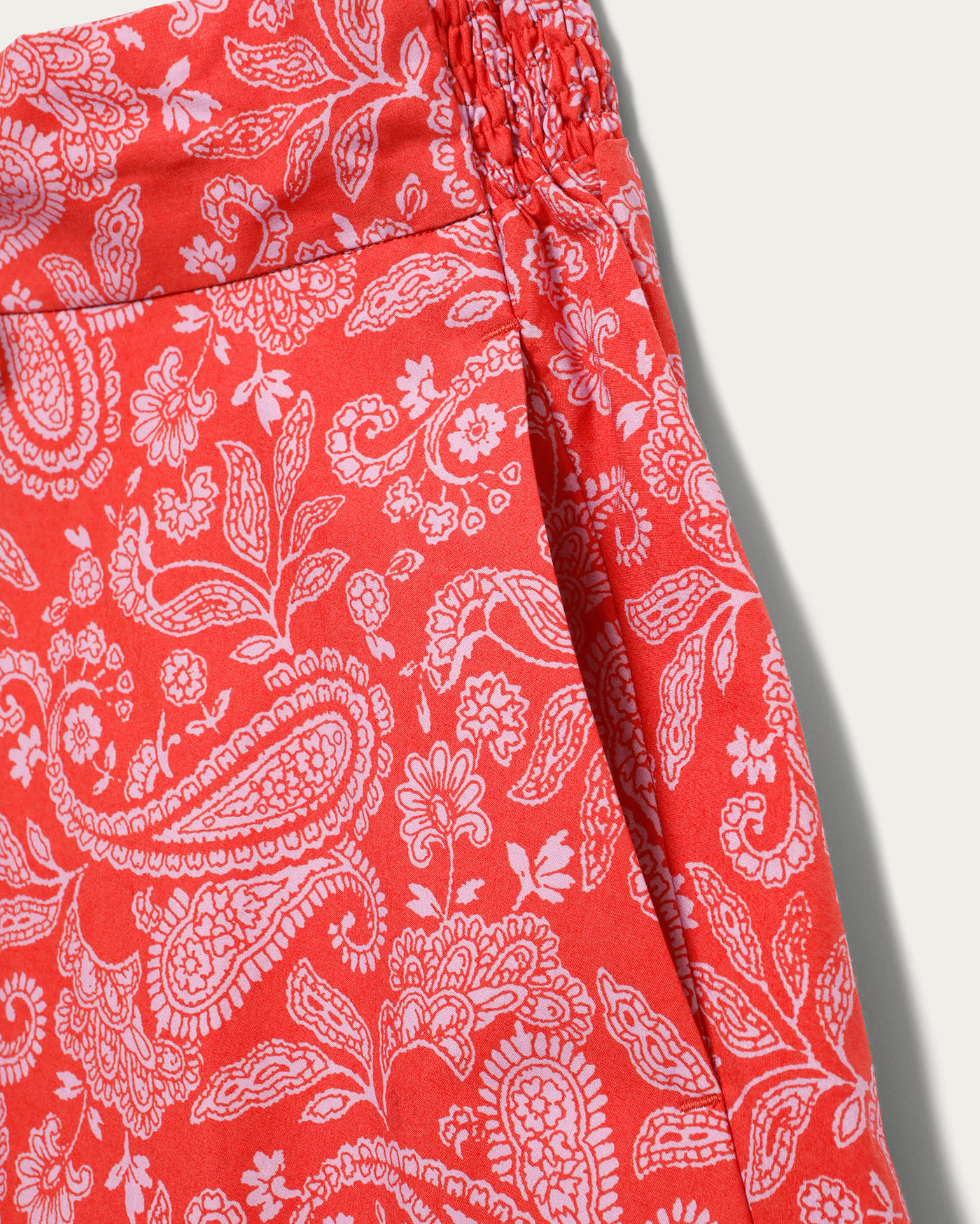 裾に向けて分量感のあるシルエットが女性らしいフレアスカート。サイズ調整も可能なウエストのドローコードがアクセントとなり、リラックス感をプラス。カラーによって柄も異なるワクワクするアイテムはシンプルなトップスと合わせてコーディネートをお楽しみいただけます。