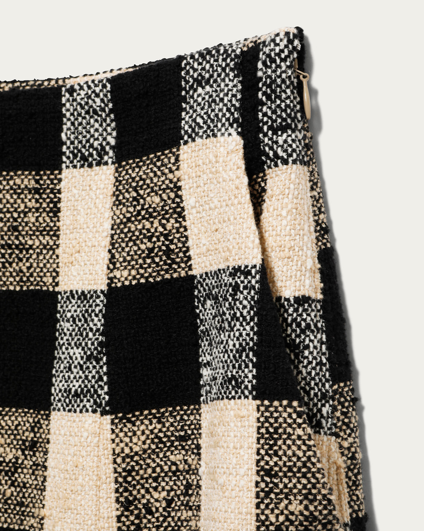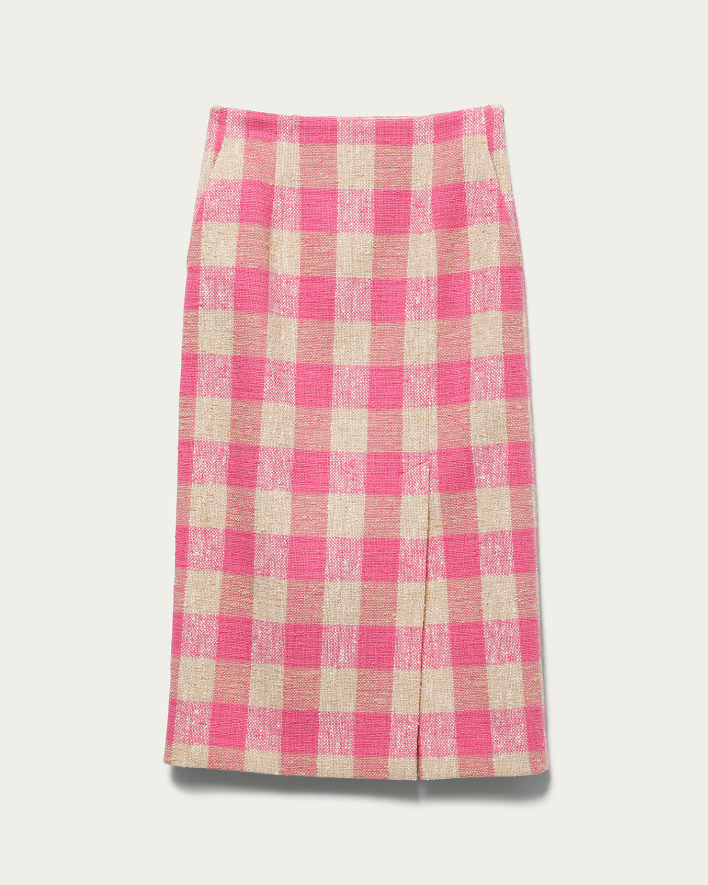 大きめのファンシーチェックが目を引くタイトスカート。イタリア BONOTTO社に別注した素材は、コットンナイロンのスラブヤーンをざっくりと織り込み、ソフトで上品な風合い。ウエスト周りをすっきりさせたベルトレスの仕立てに、フロントサイドのスリットがポイント。 スカートを主役にしたコーディネートが楽しめます。