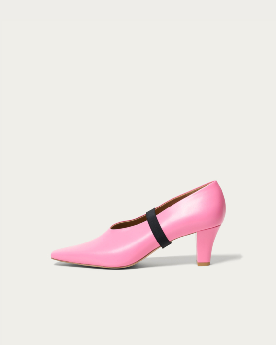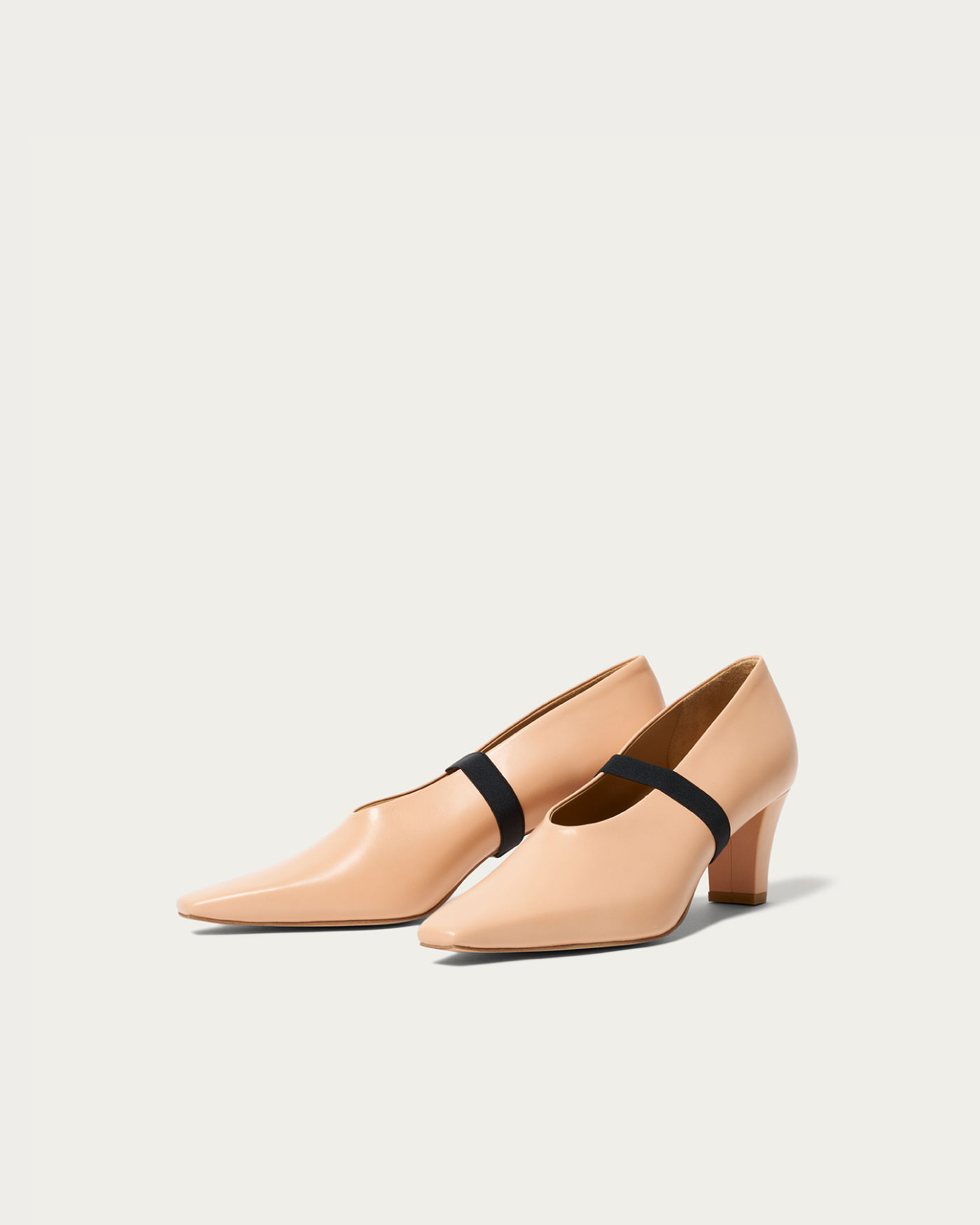 スタイリストの辻直子氏とのコラボレーションアイテム。深めの履き口とシャープなスクエアトゥのカッティングが美しいパンプスです。取り外し可能なシューズバンド付きで、どこかレトロな雰囲気がありつつも、ワードローブに新鮮さを与えてくれます。