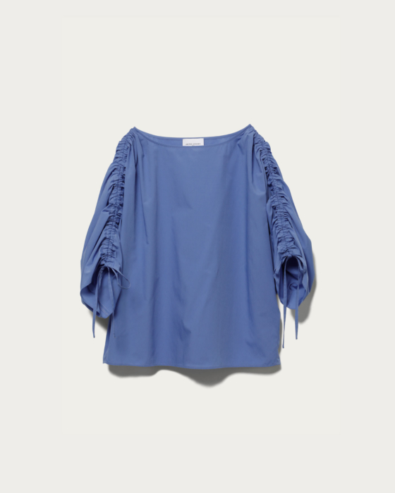 袖山から袖口にかけてのシャーリングが一枚で着映えのするブラウス。共紐のドローストリングを引っ張ることで、丈やギャザーを調整することができボリュームのアレンジも可能。やや透け感のあるソフトな風合いが特徴のシャンブレー素材を使用。フレアスカートなどと合わせてフェミンンな装いもおすすめです。