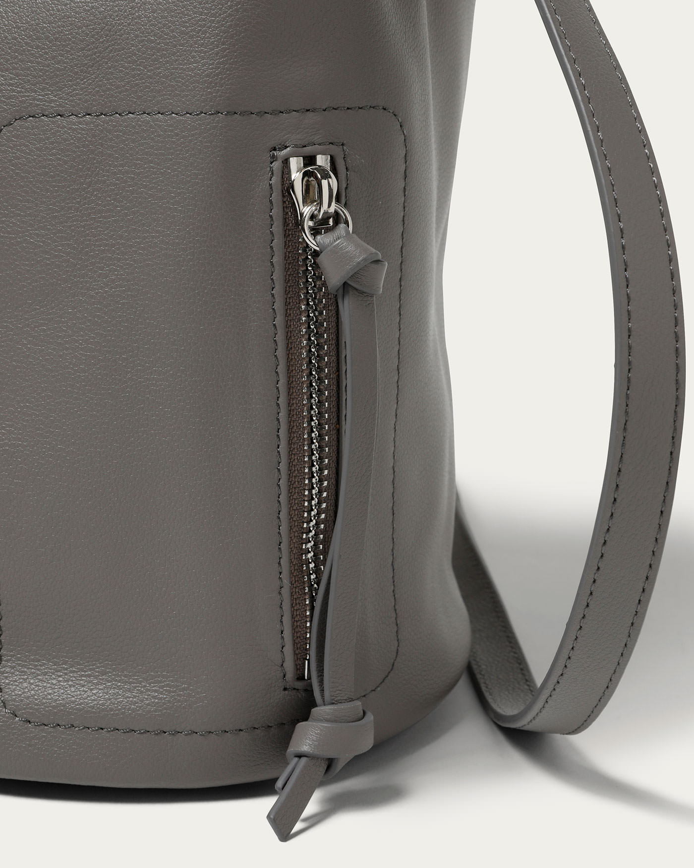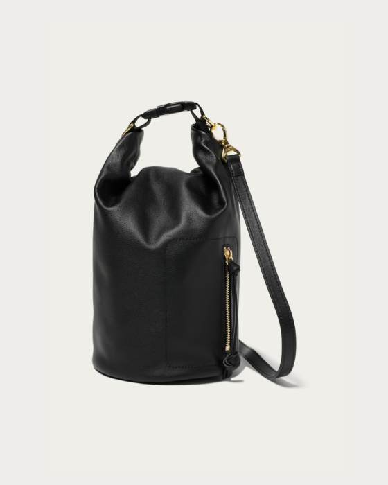 スポーツやアウトドアで使用するドライバッグからデザインの着想を得たショルダーバッグ。上品な素材でカジュアル過ぎず、大人のデイリー使いにもおすすめ。口は正面方向に2回巻いてバックルで留める仕様です。バックル部分での手持ちやショルダーで斜めがけなどアレンジが楽しめます。