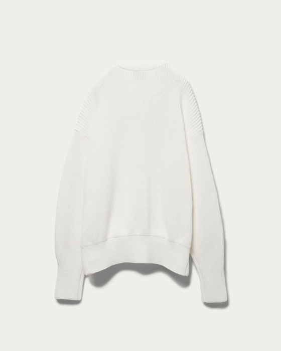 ニュアンスのある袖シルエットが一枚着で様になるアゼニットです。程よくゆとりのあるサイズ感にボリュームのある袖デザインがポイント。前身頃は斜め切り替えの編み地により着用時にはすっきりとした印象に、後ろ身頃は自然な丸みのあるシルエットを演出します。バルキーでスポンディッシュなコットンとポリエステルの混紡素材を使用した片アゼ編みはボトムス問わずコーディネートを楽しめます。