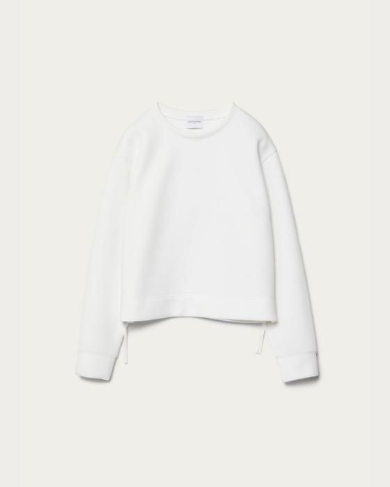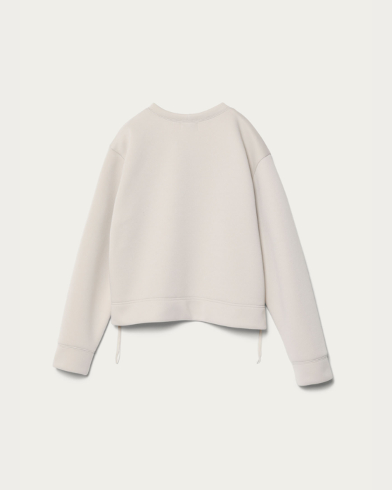 両サイド裾のファスナーがポイントのプルオーバー。回収されたペットボトルから新たな糸を作る、リサイクルポリエステル100%の素材を使用。表面をスパンポリエステルにすることで、綿のようなタッチ感を表現し、ダンボール素材特有の膨らみが特徴です。短めの着丈はハイウエストのボトムスと相性が良いバランスです。
